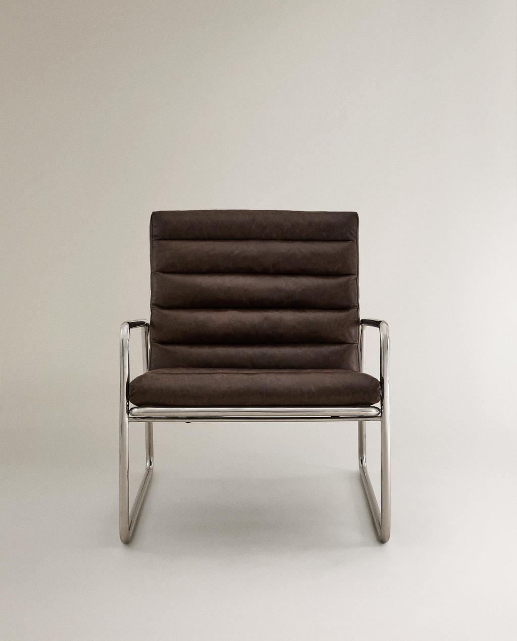 Fotel z chromowanej, rurkowej stali nierdzewnej z tapicerowanym skórzanym siedziskiem. Górna część jest dostarczana w częściach i wymaga prostego montażu. Poduszki są mocowane na zatrzaski i można je zdjąć.