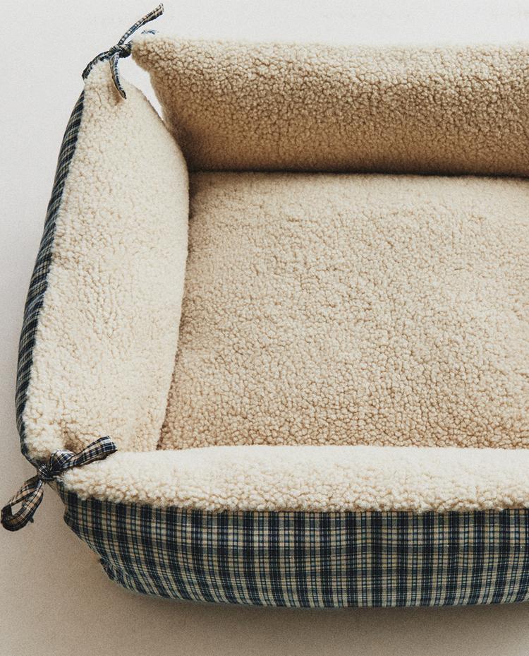 Legowisko dla zwierząt wykonane z materiału imitującego futerko, z zewnętrzną stroną w kratkę vichy i ozdobną kokardą po bokach. Zawiera dopasowaną poduszkę dla większego komfortu.