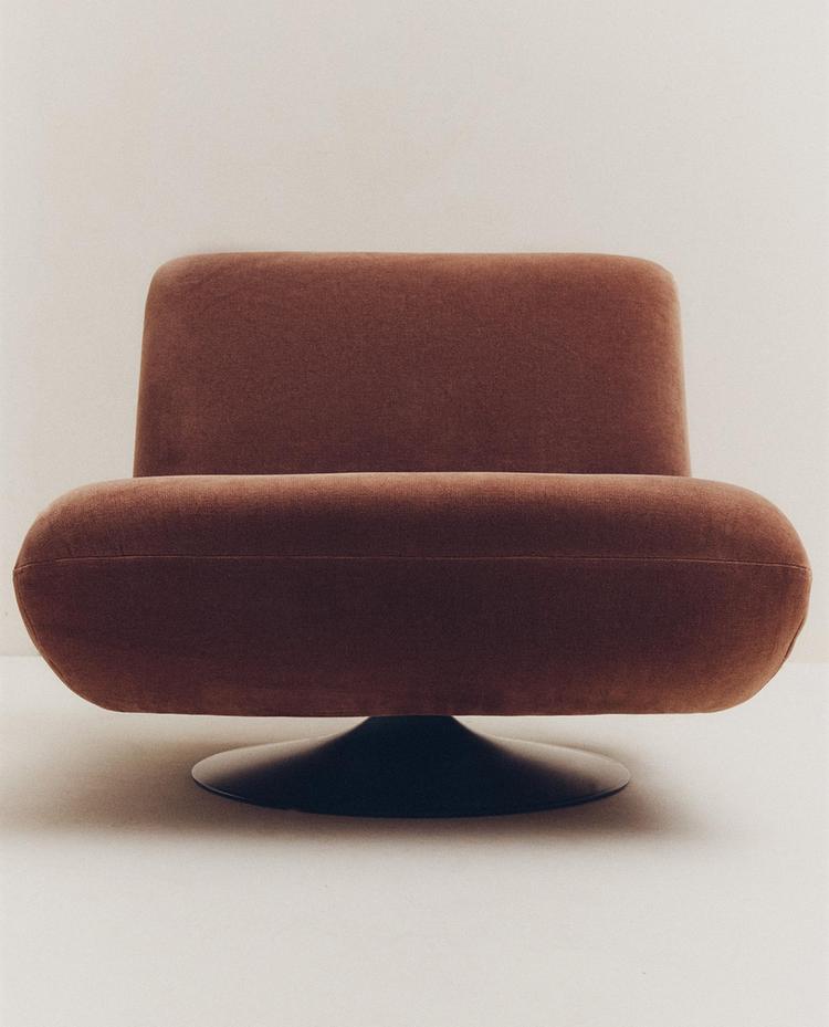 Obrotowy fotel z żelazną podstawą i welwetową tapicerką.