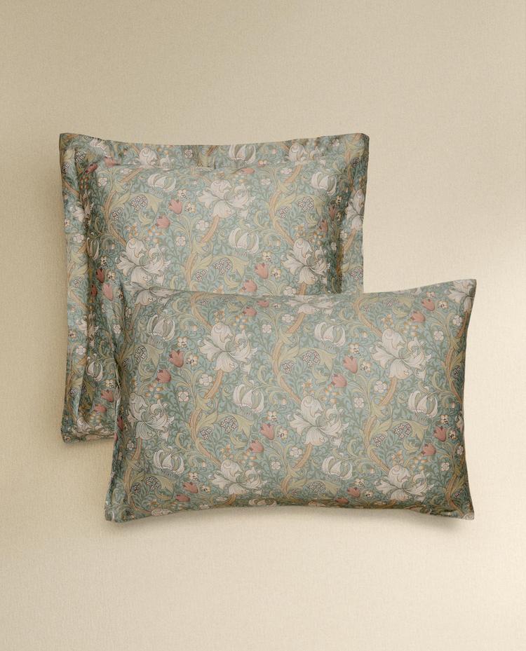 Poszewka na poduszkę z satynowej bawełny o gramaturze 300 nitek, w zielonym odcieniu z kwiatowym wzorem.