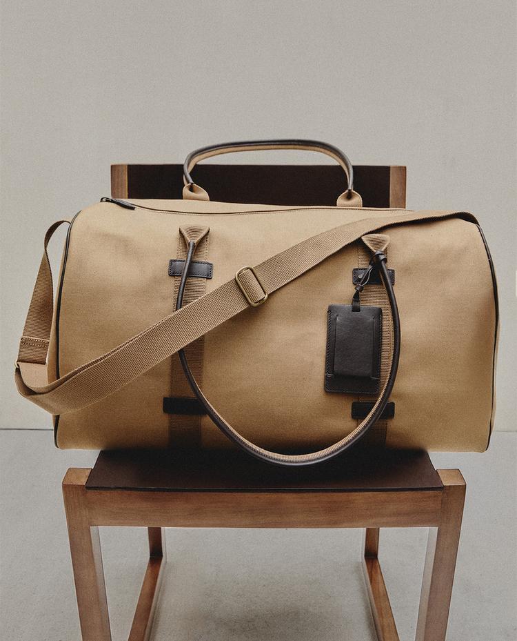 Duża torba podróżna wykonana z bawełny ze skórzanymi detalami. Zapięcie na suwak, krótka rączka i długi regulowany pasek z karabińczykami, który można łatwo odpiąć. W zestawie skórzana etykieta identyfikacyjna do personalizacji.