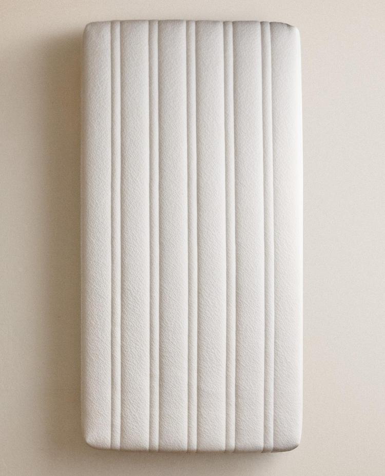 Colchão de berço com capa removível. Capa de poliéster com enchimento de espuma e fecho com debrum.