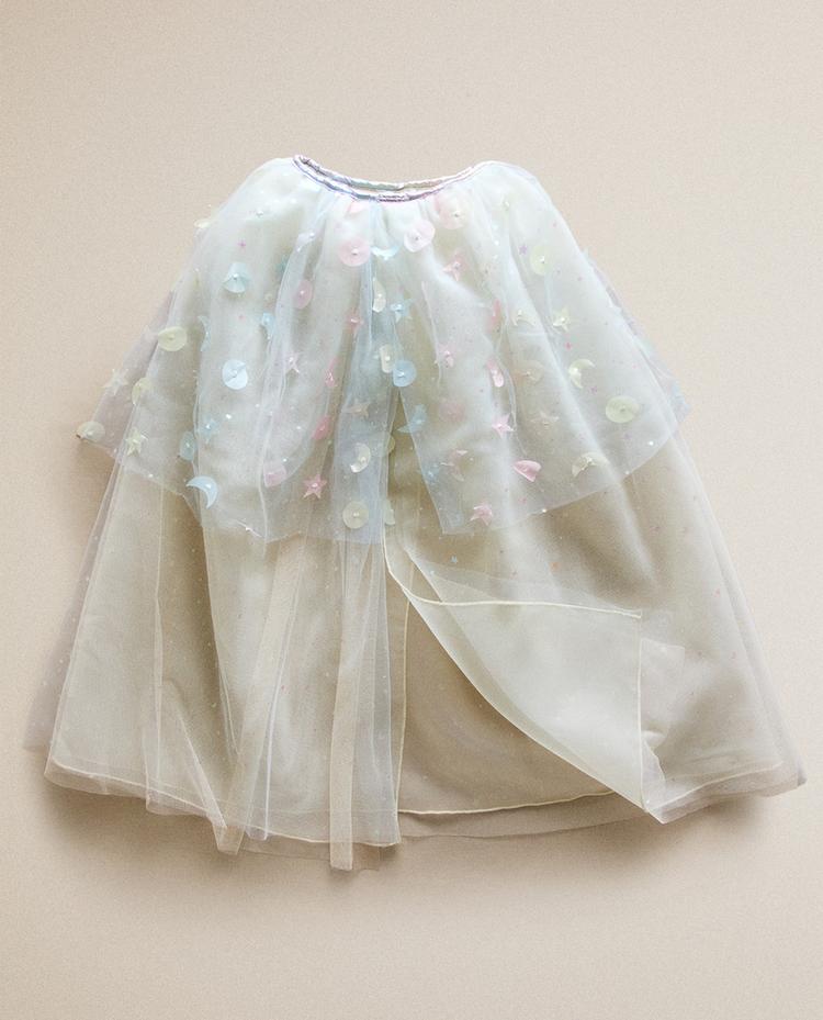 Disfarce de capa infantil. Tem pormenores decorativos brilhantes com motivos de estrelas, luas e formas suaves em tons de pastel.