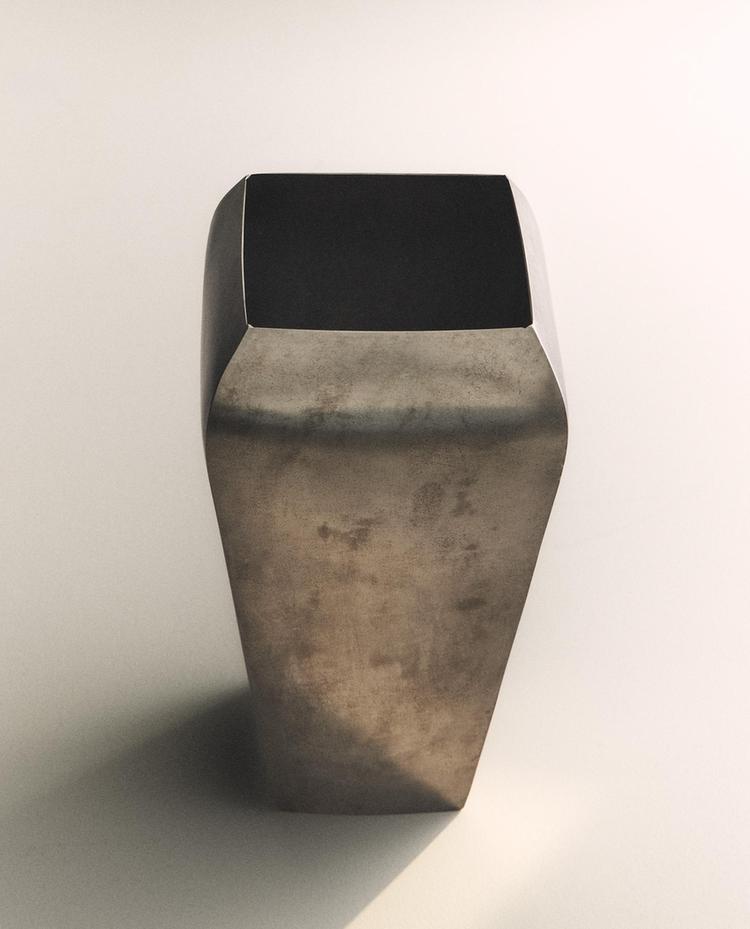 Jarra de aço com base quadrada que se vai alargando e acabamento antigo.