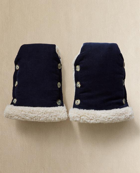 Luvas de bebé para o carrinho, confecionadas em algodão com tecido tipo bombazina e efeito de pelo encaracolado no interior.