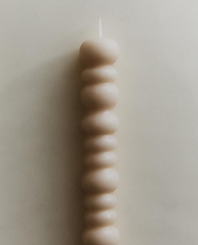 Velas decorativas em cera com design alongado e forma ondulada, diâmetro de 2,2 cm e superfície texturizada em relevo contínuo. Têm uma base direita para apoio estável e pavio central visível. O pack inclui 2 velas.
