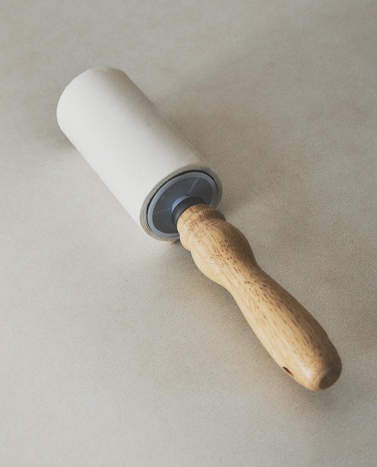 Rolo tira-borbotos adesivo com cabo de madeira de carvalho.