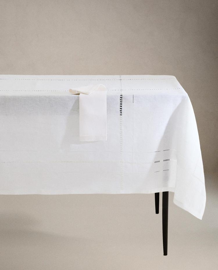 Toalha de mesa confecionada em linho com pormenor de costura decorativa bordada em diferentes tamanhos a criar um padrão de quadrados.