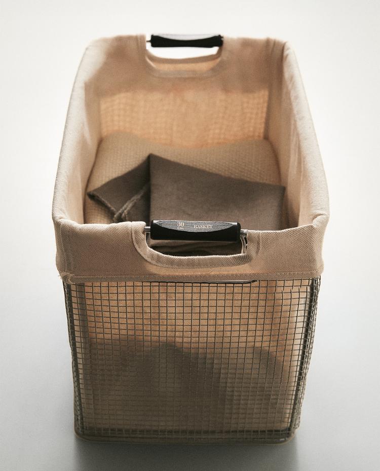 Cesta para la ropa metálica con estructura de rejilla y forro interior textil de algodón extraíble. Diseño profundo y funcional, con asas laterales con detalle de madera para facilitar su transporte.