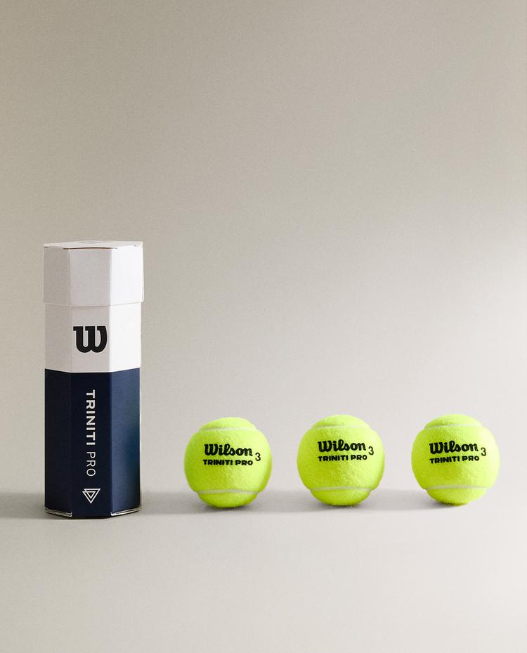 Tub cu mingi de tenis, model Triniti Pro, de la Wilson. Acestea combină performanțe ridicate cu senzații bune de lovire, datorită combinației miezului cu pâsla utilizată pentru fabricarea lor.