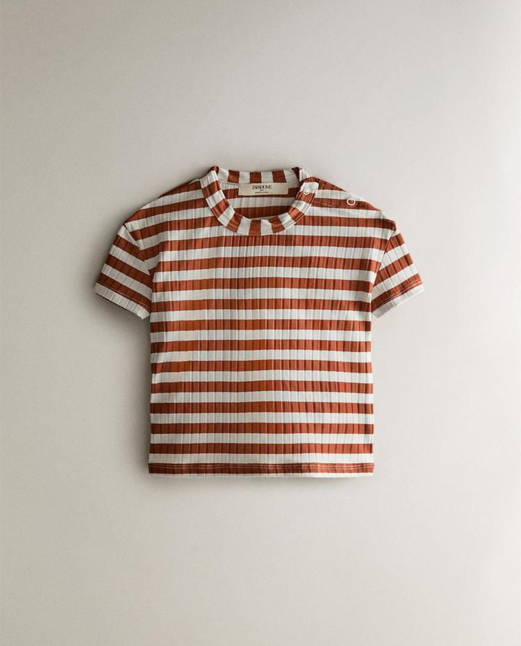 Tricou de baie pentru copii, conceput pentru plajă și joacă în apă, cu mânecă lungă, guler rotund și imprimeu în dungi.