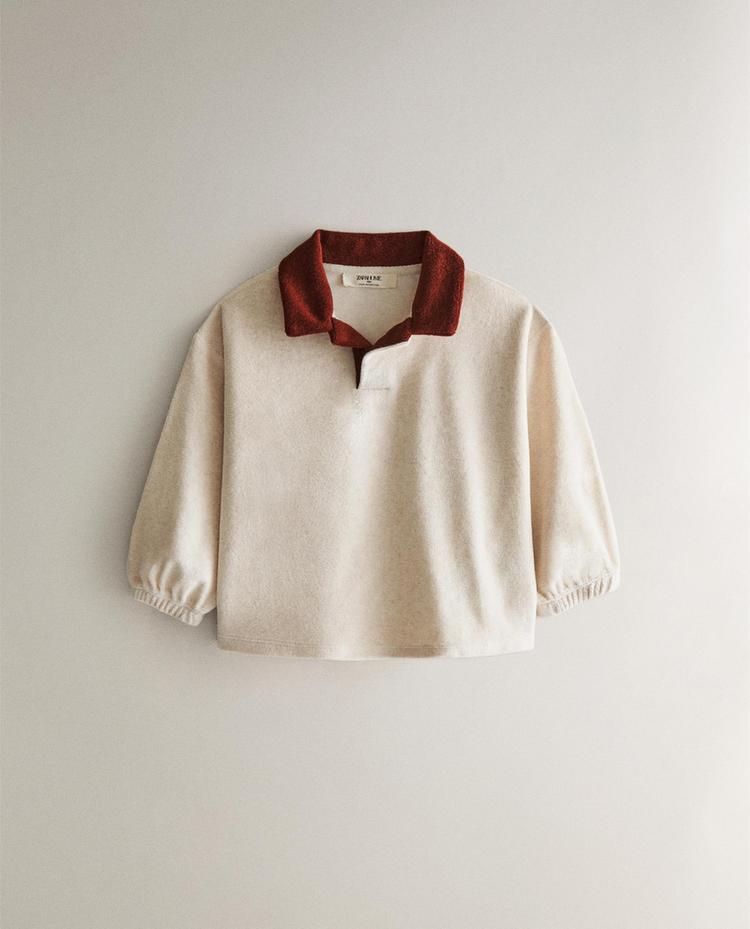 Hanorac pentru copii confecționat din bumbac tip frotir, cu guler polo în culori contrastante și manșete elastice.
