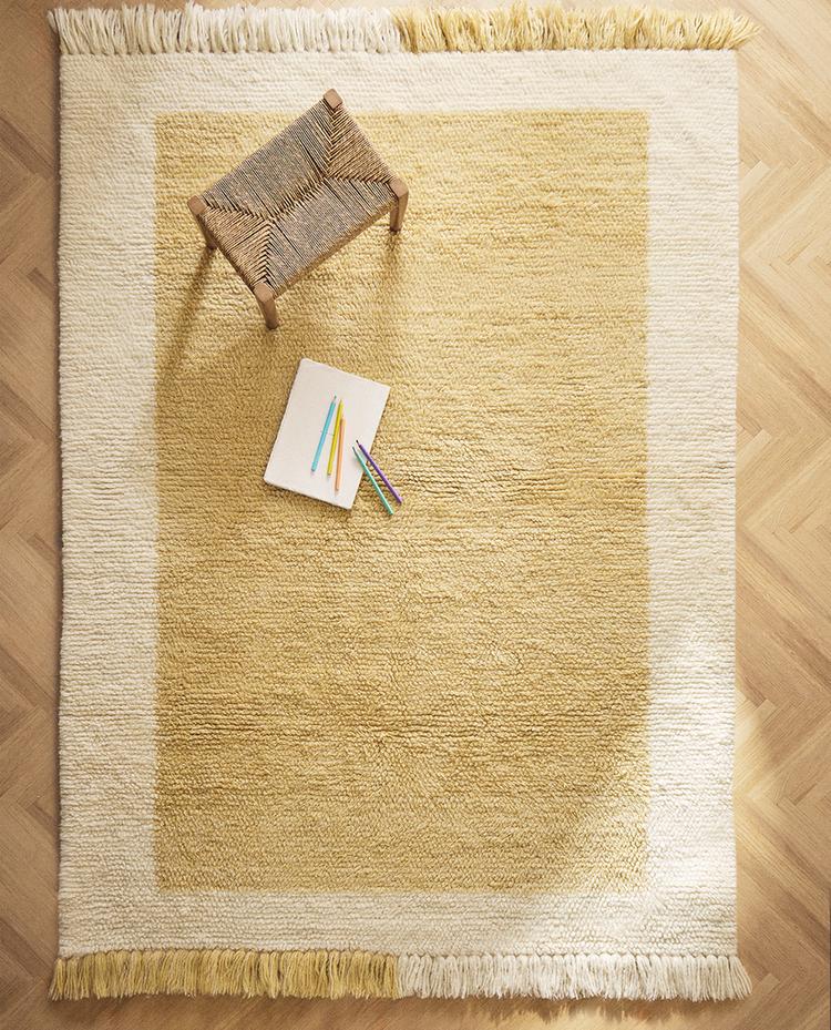 Covor confecționat din lână cu model color block și franjuri contrastante la capete.
