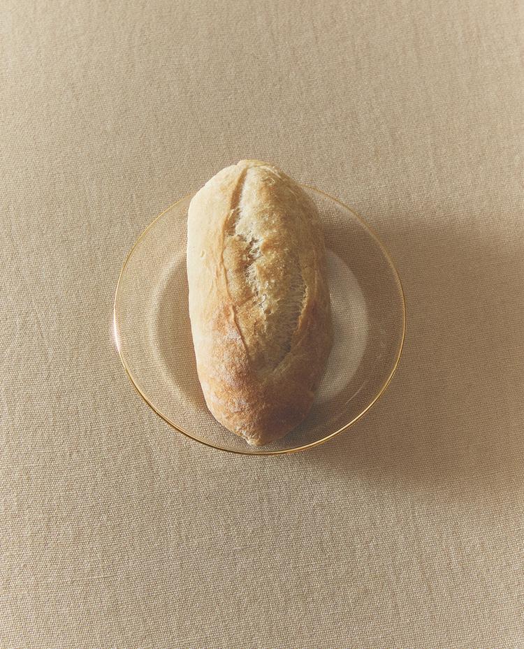 Farfurie de pâine din borosilicat transparent, cu o muchie în contrast.