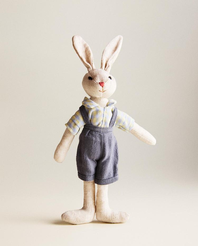 Jucărie de pluș pentru copii, în formă de iepuraș îmbrăcat într-o salopetă și o cămașă în carouri.