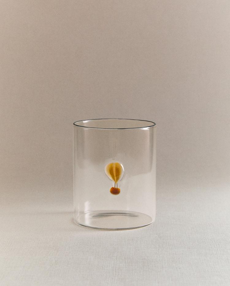 Dečija čaša od borosilikata za četkice za zube, sa centralnim dizajnom balona na vruć vazduh i rubom čaše u kontrastnoj boji.