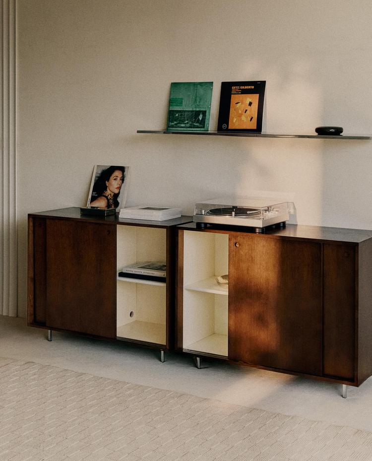 Drvena stalaža sa kliznim vratima, unutrašnjom policom i metalnim nogarima.