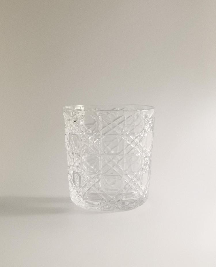 كوب مصنوع من الزجاج الشفاف صغير بتصميم بارز.