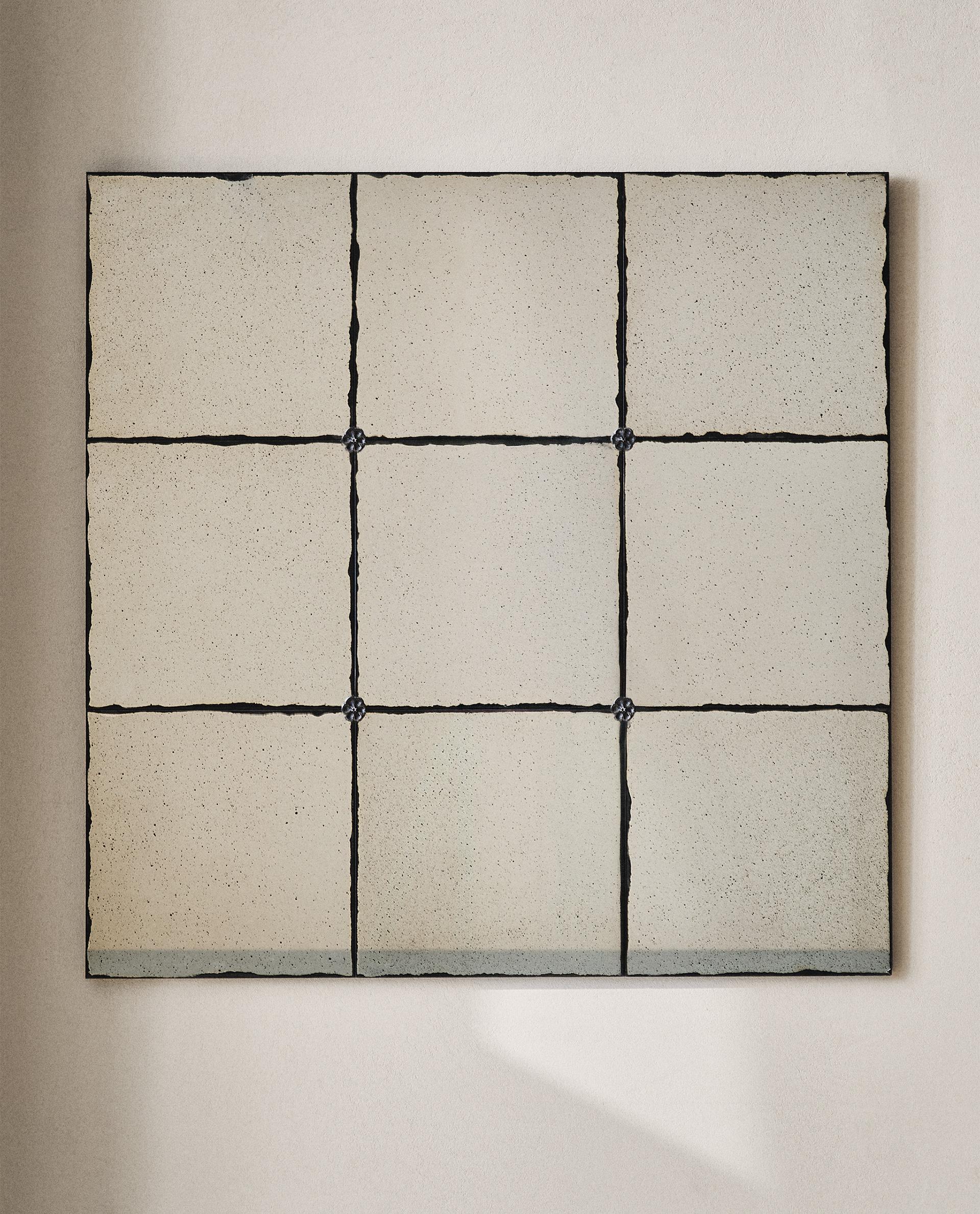Dekorativ väggspegel om 90 x 90 cm i fönstermodell med kvadrater åtskilda av metallspröjs.