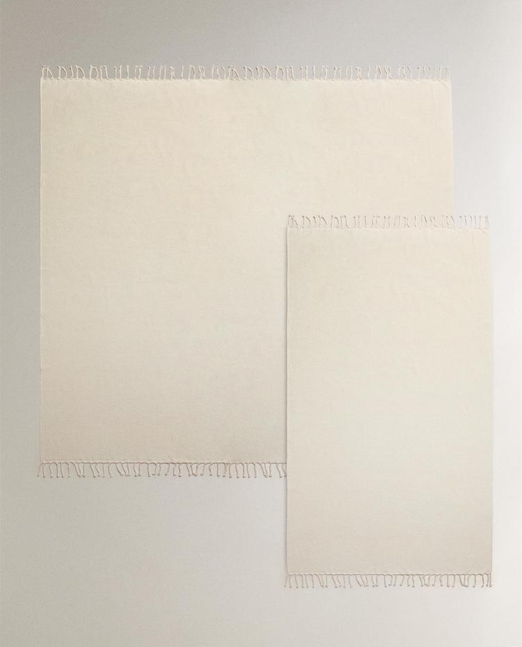 Brisača za na plažo iz bombažnega frotirja v enobarvnem odtenku, zaključena z zvitimi resicami na zgornjem in spodnjem robu.