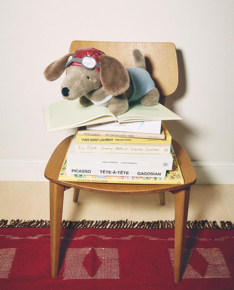 Otroška plišasta igrača v obliki psa jazbečarja, z letalsko opravo, ki vključuje očala in čelado.