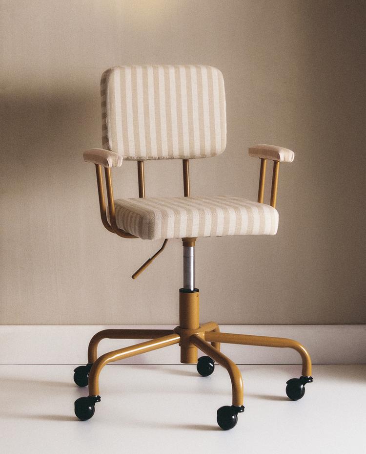 Detská kancelárska stolička s kovovou konštrukciou. Je otočná, vybavená kolieskami a jej výška je nastaviteľná. Sedák, operadlo a opierky rúk sú čalúnené bavlneným ľanom s pruhovaným vzorom. Produkt sa dodáva v dvoch kusoch, so samostatným sedadlom a základňou, čo umožňuje rýchlu a jednoduchú montáž.