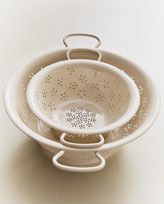 Lakované oceľové cedidlo s bočnými uškami a s otvormi v tvare kvetov.