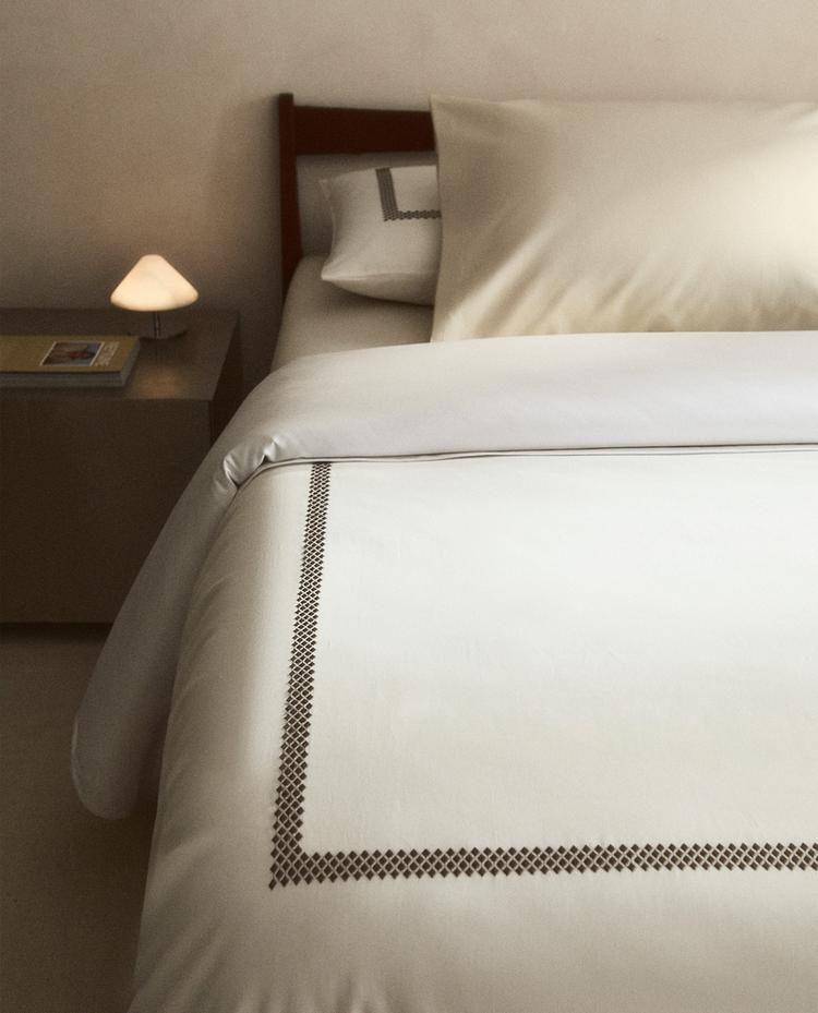 Duvet cover in 300 thread count cotton sateen with an embroidered geometric design.