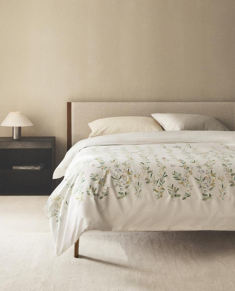 Duvet cover in 300 thread count sateen with a small leaf and floral print on the bottom.