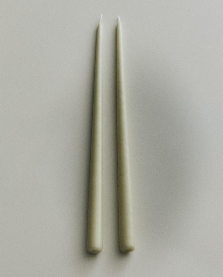 Long decorative wax candle with a matte finish, cylindrical section 2.2 cm in diameter, smooth surface and narrow base compatible with standard candle holder.