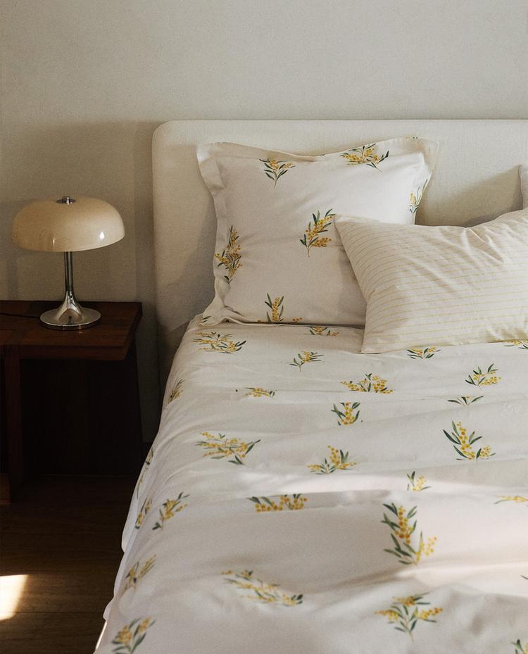 Duvet cover in 220 thread count cotton sateen with a mimosa floral print.