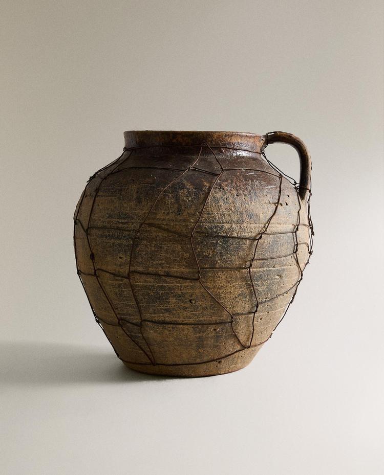 Terracotta vase. It has a rounded shape that gently narrows towards the top with a short, slightly open neck, a top handle and grill detail that covers the entire surface.