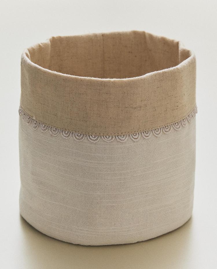 Corbeille à pain en tissu de coton de couleur naturelle, avec un détail décoratif de dentelle brodée sur le dessus et un design souple.