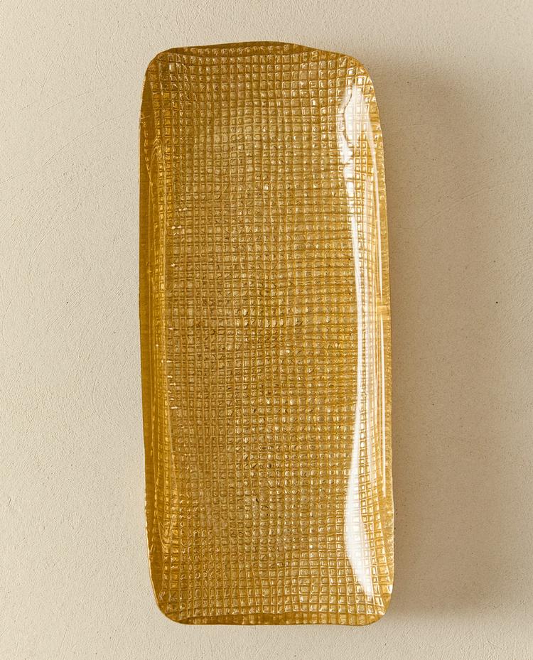 Plat rectangulaire en verre à texture irrégulière et finition dorée brillante.
