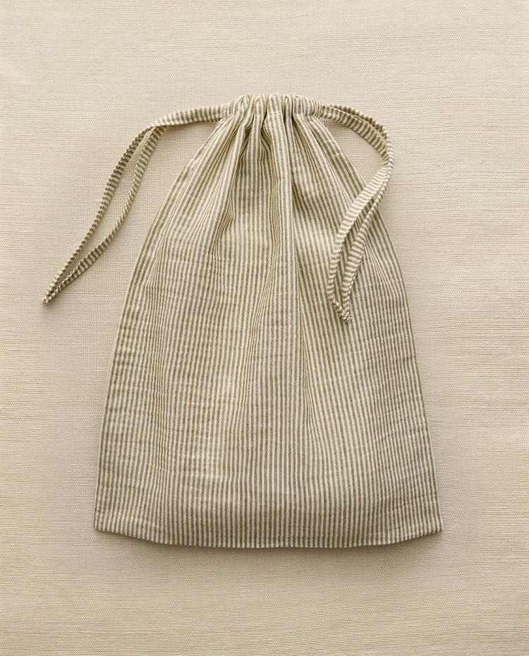 Üstte büzme ipi kapamalı, muslin kumaş türünde ve çizgili tasarıma sahip pamuklu çocuk elbise çantası.