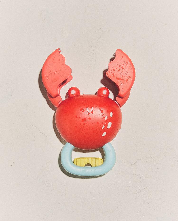 Yengeç şeklinde, dayanıklı malzemeden üretilmiş, kıskaçlarıyla kum toplamak için baskı mekanizmalı çocuk plaj oyuncağı.