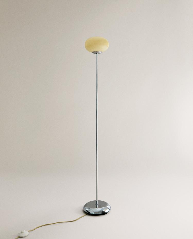 Cam ve metal ayaklı abajur. Tasarım, daha ince ve sade bir yapı ile karakterizedir ve stabilite sağlayan sağlam tabanlıdır. Abajur, küre şeklinde, hafif oval, balonun görünümünü çağrıştırarak fark yaratan ve modern bir görünüm kazandırır.