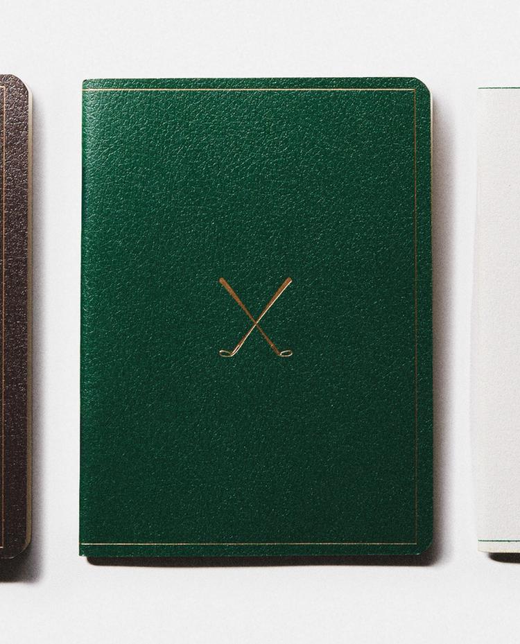 Набір із трьох блокнотів формату А3 з м’якою обкладинкою та мінімалістичним дизайном, прикрашених ілюстраціями на тему гольфу. Кожен блокнот має свій колір та унікальну ілюстрацію на обкладинці із зображеннями лунки, м’яча та ключок для гольфу.