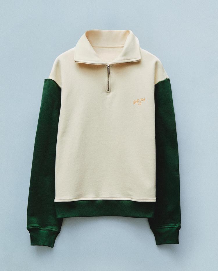 Світшот, виготовлений переважно з бавовни. Має комір на блискавці та довгі рукави. Однотонний дизайн з контрастним кольором на рукавах та по низу. Вишивка на грудях з написом "Golf Club" та обтислі манжети та низ.