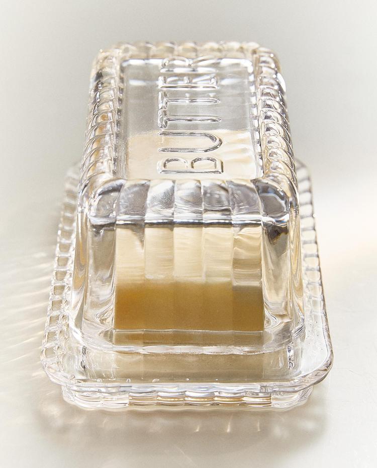 Скляна масельничка з кришкою, рельєфним візерунком у смужку й написом «BUTTER».
