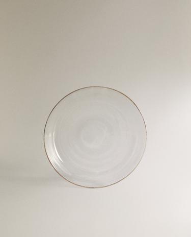 Transparent borosilicate glass side plate with a contrasting rim.