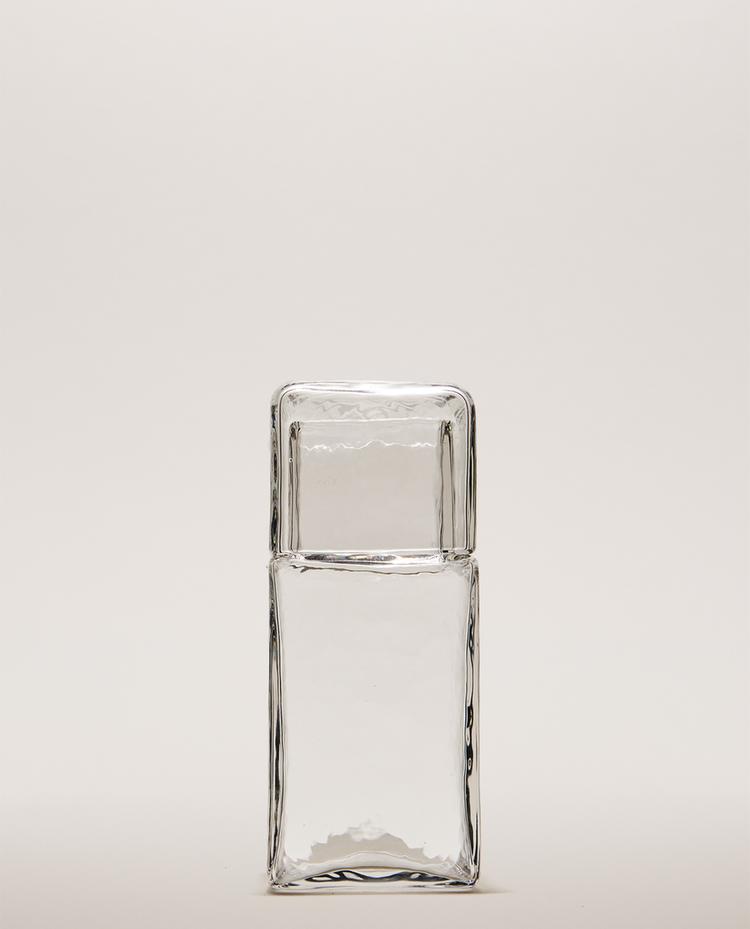 Transparent glass night set consisting of a bottle and a glass that fits on top as a lid. It features a geometric design with straight lines and a textured finish.