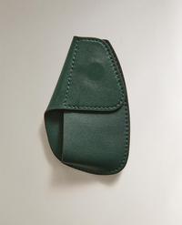 Golf ball and tee case made primarily from bovine leather. Compact design with top zip closure, lined interior, exterior tee holder, and side carabiner for attachment. Features a perforated panel detail and contrasting finishes.