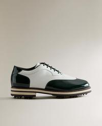 Leather golf sneakers. Topstitching detail on the upper. Contrasting front and back. Lace-up closure. Features cleats on the sole for better grip and traction.