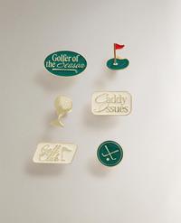Metal pins with golf motifs. The pack includes 6 units, each with a different design: texts "Golfer of the season", "Caddy Issues" and "Golf Club", and motifs of a hole, ball and golf clubs.