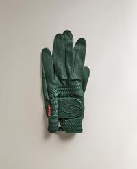 Men's right-hand golf glove crafted from goatskin leather. Fitted design with perforations for enhanced breathability and a hook-and-loop strap closure at the wrist. Solid design with embossed details.