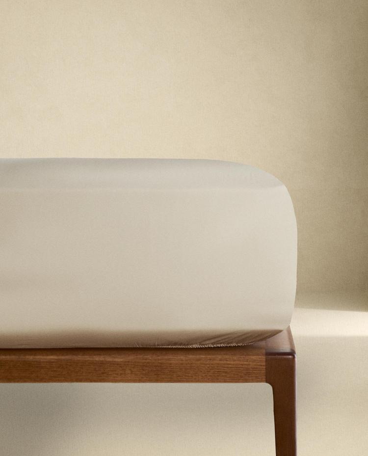 Plain adjustable fitted sheet in 200-thread-count cotton percale, for a 15.7" thick mattress.