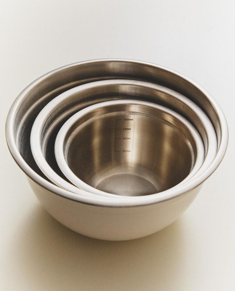 Stainless steel mixing bowl with a lacquered white exterior. Measurements are laser-cut on the inside so your recipes always turn out perfect. Freezer safe. Available in different sizes. Stackable.