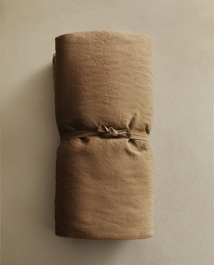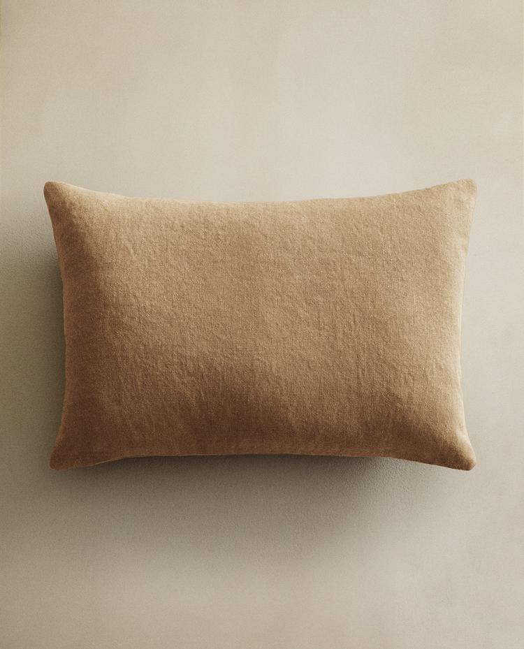 Decorative throw pillow cover made of washed linen fabric, with a hidden zipper fastening at the bottom.