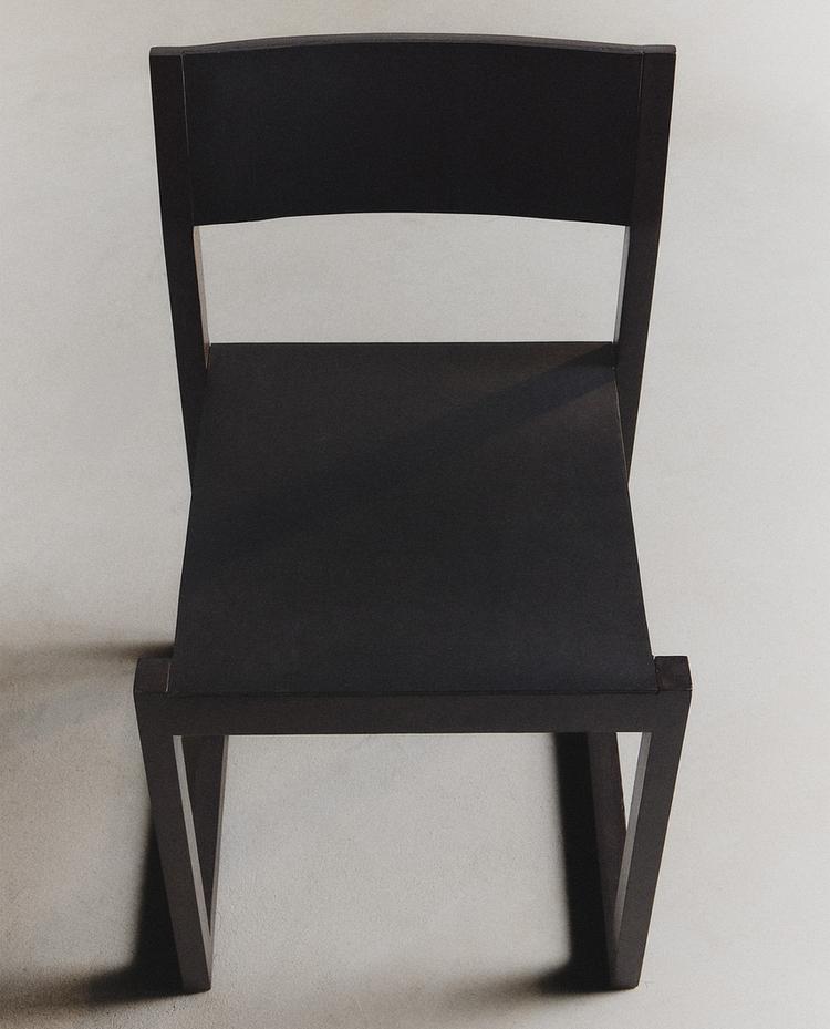 Dark chair with a wooden frame and a leather seat and backrest.